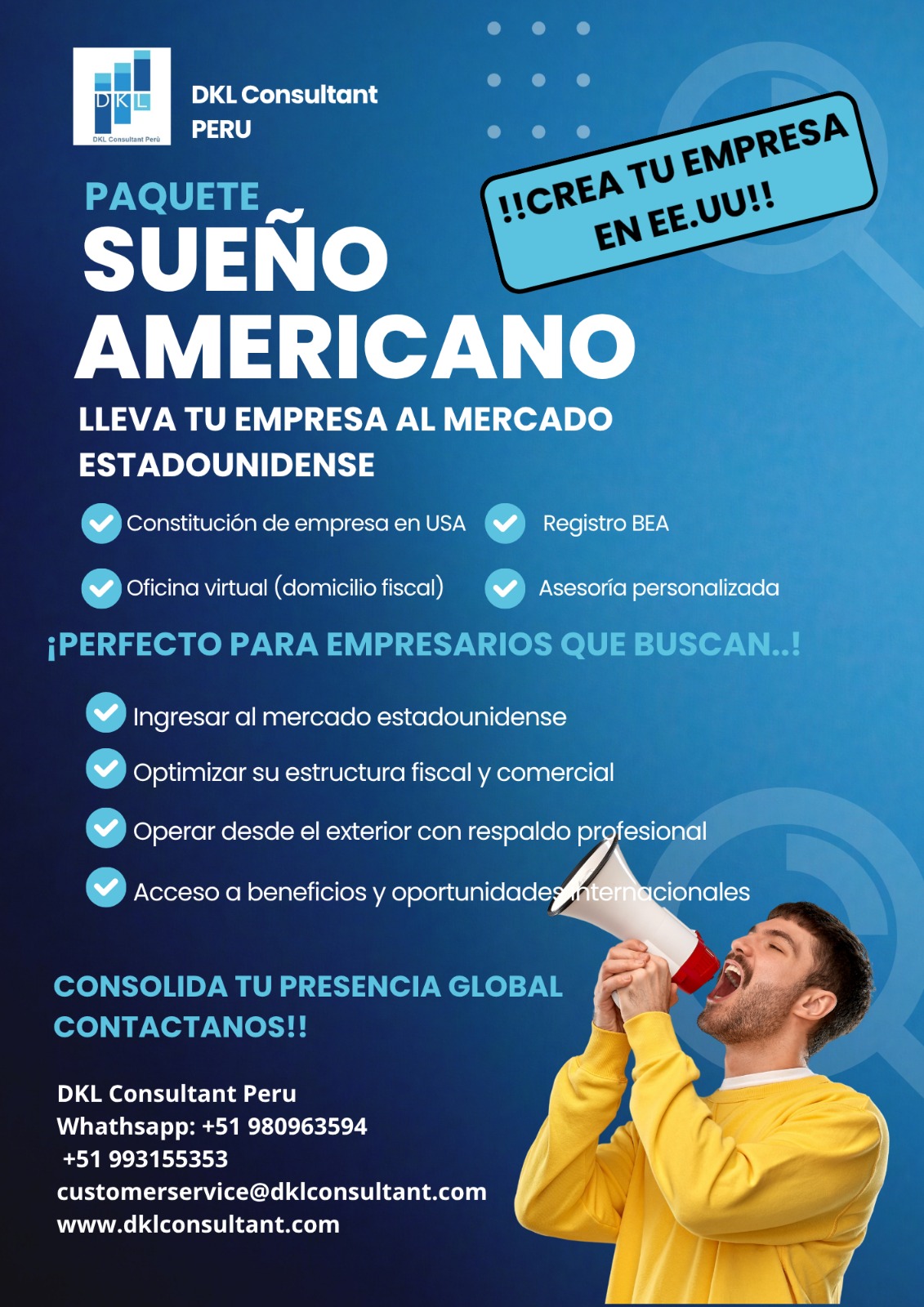 DKL CONSULTANT PERU surge a partir de la experiencia de DKL CONSULTANT USA, empresa con una trayectoria consolidada trabajando con clientes de distintos países que exportan y comercializan sus productos en Estados Unidos. A lo largo de ese recorrido, se obtuvo un conocimiento profundo de los requisitos, estructuras y desafíos que enfrentan las empresas internacionales al ingresar al mercado estadounidense.